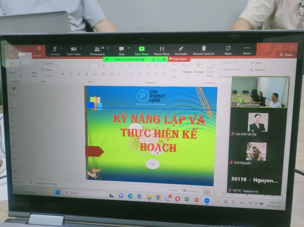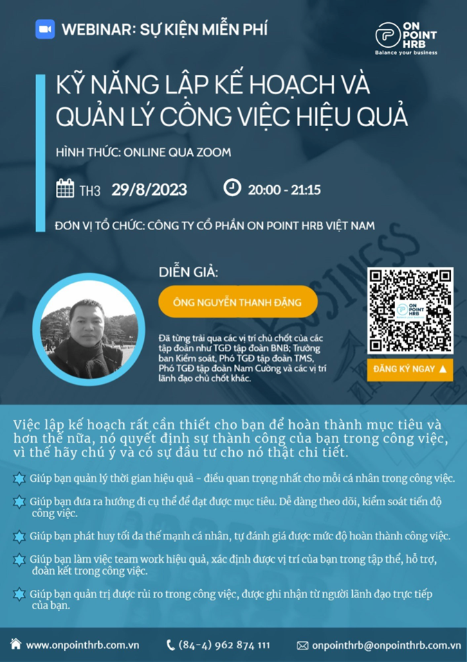 Ngày 29/08/2023, Công ty cổ phần On Point HRB Việt Nam chủ trì tổ chức Chương trình Webinar: Kỹ năng lập kế hoạch và quản lý công việc hiệu quả. Chương trình có sự tham gia đông đảo của các thành viên Cộng đồng kiến thức ngành nhân lực. Đây là sự kiện đầu tiên Công ty On Point HRB tổ chức để triển khai các công việc trong lĩnh vực quản trị doanh nghiệp.
